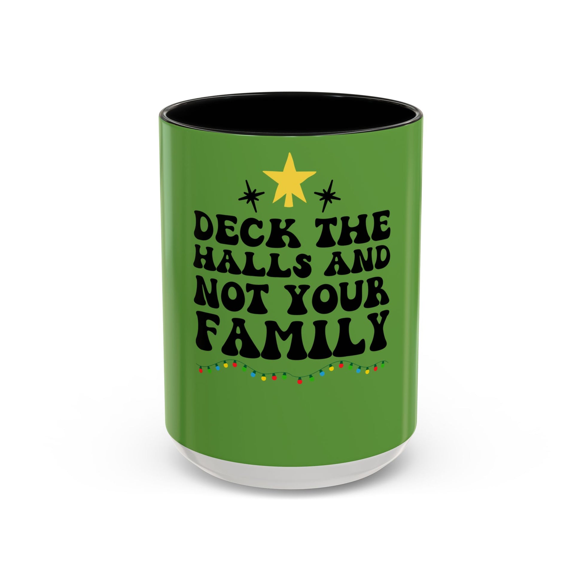 This bright ceramic mug brings holiday humor to your morning coffee. A vivid green wraparound background framed by a contrasting black interior and handle makes the cheeky message — “Deck the halls and not your family” — pop in bold, playful type, with a little string of lights and a star adding festive charm. It feels like a wink from a friend: warm, a little sassy, and perfectly suited to quieter, laugh-filled holiday mornings or messy family gatherings when you need a gentle way to keep things light. Durable glossy ceramic holds heat well and the high-contrast colors keep the design cheerful cup after cup.
